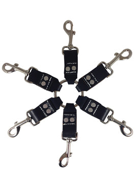 Sportsheets Edge Leather 6 Point Hog Tie. Cowhide leather. Nickel free hardware. Only 6 point hog tie on the market. Can be used with Edge Wrist, Ankle, Arm Cuffs and other attachments. Handcrafted in the USA. Includes: One center o-ring with 6 hand sewn leather points of attachment. Materials: Cowhide Leather, Nickel Free Hardware.