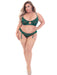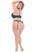 Two piece bra set. Floral lace long line bra with keyhole front, tassel charm, underwire, hook and eye back, gold hardware, and thong with attached garters.