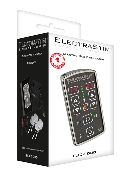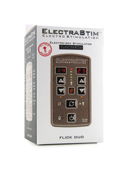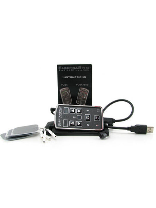 A revolution in electro stimulation technology the ElectraStim Flick Duo Stimulator Pack not only has seven built-in programs including escalating patterns but is also able to stimulate in rhythm with Flicking movements of the control unit!