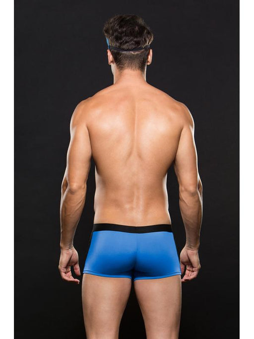 Freeze!!! Stand tall in this two-piece police trunk and hat. The badge and cuff detail on the trunks gives an element of authority, and the hat pulls it all together. Hand wash only. Do not bleach or iron. Hang dry. 90% Polyester, 10% Spandex.