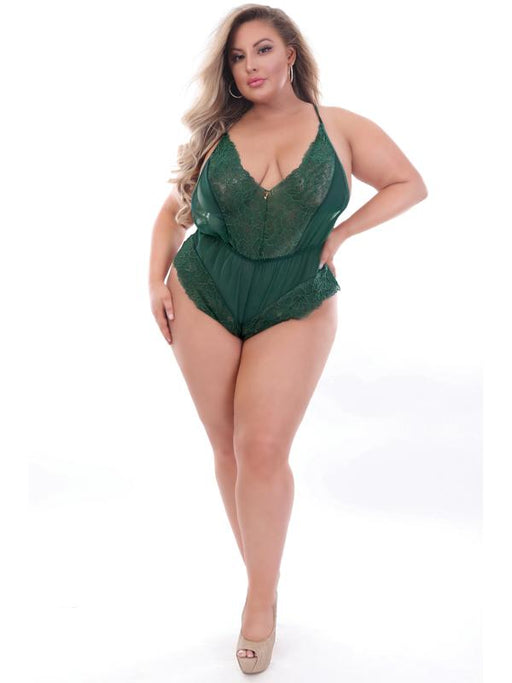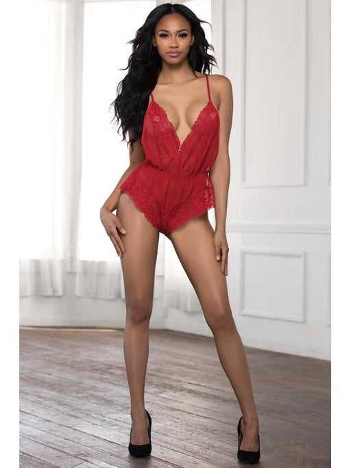 Lace long sleeve teddy with plunging neckline, satin elastic waist, removable garters, and snap crotch.