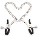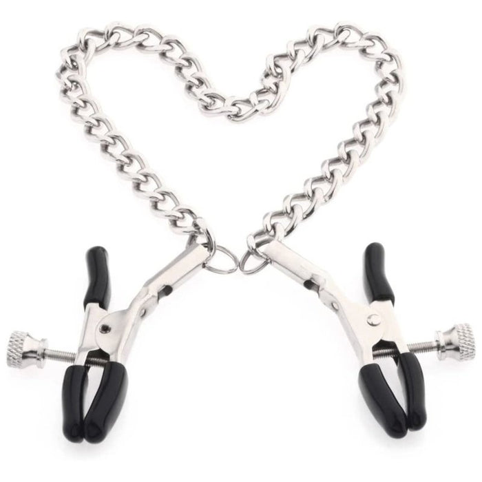 Clip each clamp in place, adjusting the screw pin to set the tension to provide pinching pleasure with a hint of pain. Enhance the sensation further by gently tugging on or adding weights to the chain.