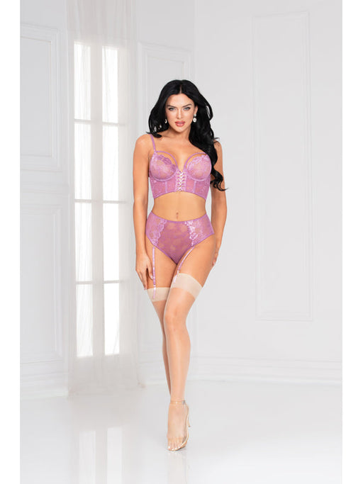 Two piece bra set. Lace and mesh long line bra with underwire, grommet lace-up front, adjustable industrial straps, hook and eye back, and high wai...